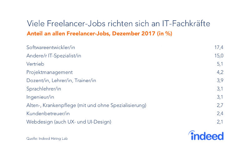 Freiberufliche Tätigkeiten gewinnen immer mehr an Attraktivität auf dem deutschen Arbeitsmarkt. So hat sich Anzahl der Suchen nach derartigen Jobs in den letzten zwei Jahren mit einem Anstieg um 94,7 Prozent nahezu verdoppelt. Das ist das Ergebnis einer Arbeitsmarktanalyse des Indeed Hiring Labs. Unter der Leitung von Annina Hering, Economist bei Indeed, wurden dafür bundesweite Stellenausschreibungen und Jobsuchen von 2015 bis 2017 ausgewertet. Viele Arbeitgeber stellen sich auf diesen unverkennbaren Trend ein und schreiben vor allem Stellen in Mangelberufen zunehmend auch als Freelancer-Jobs aus. So werden hauptsächlich Softwareentwickler/innen (17,4% der ausgeschriebenen Freelancer-Jobs) sowie andere IT Spezialisten/innen (15%) als sogenannte "Freie Mitarbeiter" gesucht. Die ausführliche Auswertung finden Sie hier: https://ots.de/isbowj
