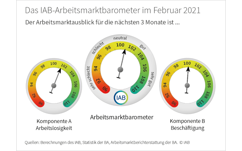 Das IAB-Arbeitsmarktbarometer ist ein seit November 2008 bestehender Frühindikator, der auf einer monatlichen Umfrage der Bundesagentur für Arbeit unter allen lokalen Arbeitsagenturen basiert. Während Komponente A des Barometers die Entwicklung der saisonbereinigten Arbeitslosenzahlen für die nächsten drei Monate prognostiziert, dient Komponente B der Vorhersage der Beschäftigungsentwicklung. Der Mittelwert aus den Komponenten „Arbeitslosigkeit“ und „Beschäftigung“ bildet den Gesamtwert des IAB-Arbeitsmarktbarometers. Dieser Indikator gibt damit einen Ausblick auf die Gesamtentwicklung des Arbeitsmarkts. Da das Saisonbereinigungsverfahren laufend aus den Entwicklungen der Vergangenheit lernt, kann es zu nachträglichen Revisionen kommen. Die Skala des IAB-Arbeitsmarktbarometers reicht von 90 (sehr schlechte Entwicklung) bis 110 (sehr gute Entwicklung).