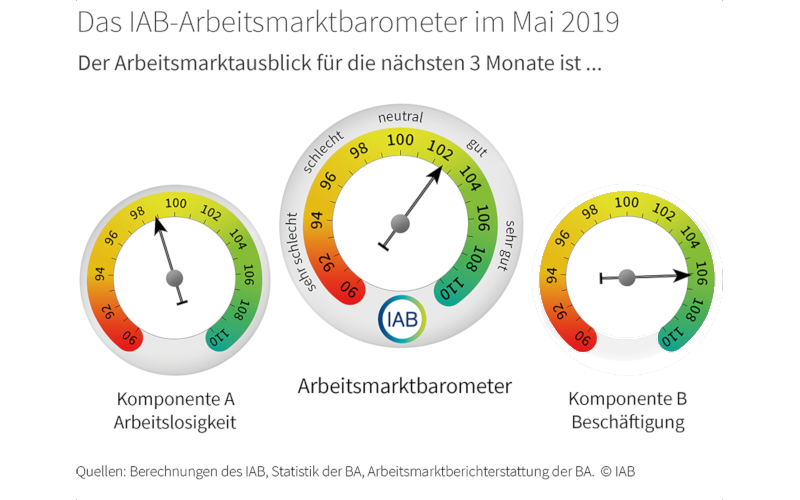 Das IAB-Arbeitsmarktbarometer ist ein Frühindikator, der auf einer monatlichen Umfrage der Bundesagentur für Arbeit unter allen lokalen Arbeitsagenturen basiert. Während Komponente A des Barometers die Entwicklung der saisonbereinigten Arbeitslosenzahlen für die nächsten drei Monate prognostiziert, dient Komponente B der Vorhersage der Beschäftigungsentwicklung. Der Mittelwert aus den Komponenten „Arbeitslosigkeit“ und „Beschäftigung“ bildet den Gesamtwert des IAB-Arbeitsmarktbarometers. Dieser Indikator gibt damit einen Ausblick auf die Gesamtentwicklung des Arbeitsmarkts. Da das Saisonbereinigungsverfahren laufend aus den Entwicklungen der Vergangenheit lernt, kann es zu nachträglichen Revisionen kommen. Die Skala des IAB-Arbeitsmarktbarometers reicht von 90 (sehr schlechte Entwicklung) bis 110 (sehr gute Entwicklung).