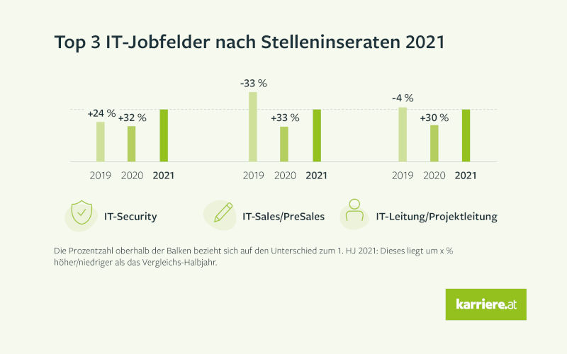 Auch im IT-Bereich wird momentan intensiv nach Fachkräften gesucht: Im ersten Halbjahr 2021 wurden um 5 Prozent mehr IT-Stelleninserate geschaltet als im Vergleichszeitraum 2019. Besonders begehrt sind dabei IT-Security-Stellen: In diesem Bereich werden ein Viertel mehr Stellen (+24 Prozent) gesucht als vor der Krise. Darüber hinaus werden heuer IT-Jobs schneller besetzt: Betrug die Laufzeit der IT-Stelleninserate 2019 im Durchschnitt 70 Tage, so werden diese heuer bereits nach 65 Tagen deaktiviert. „Unsere Erfahrung zeigt, dass die meisten Unternehmen ein Stelleninserat deaktivieren, sobald die betreffende Stelle besetzt ist. Die IT-Branche ist durch die Krise noch attraktiver geworden, zahlreiche Benefits wie flexible Arbeitszeiten und ein höheres Durchschnittsgehalt als vor der Pandemie tragen dazu bei“, sagt Georg Konjovic. Das durchschnittliche Bruttomonatseinkommen in der IT-Branche ist laut karriere.at-Stelleninseraten von 2019 auf 2021 um rund 9 Prozent gewachsen: von 2.892 auf 3.180 Euro.