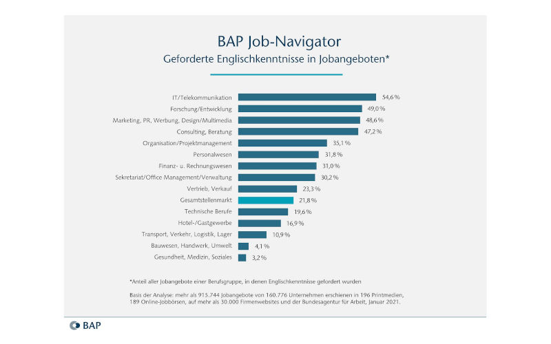 Im Januar 2021 wurden insgesamt 915.744 Positionen von mehr als 160.000 Unternehmen veröffentlicht. Mit sehr deutlichem Abstand wird das Sprachenranking von Englisch angeführt. Bei knapp 200.000 im Januar 2021 ausgeschriebenen Jobs wurden von 41.700 Unternehmen Englischkenntnisse verlangt, das entspricht 21,8 Prozent aller ausgeschriebenen Positionen. Mehr als ein Drittel dieser Unternehmen forderten von den Bewerbern fortgeschrittene Kenntnisse, um verhandlungssicher mit Kunden oder Mitarbeitern kommunizieren zu können. In zehn Prozent wurden mindestens Grundkenntnisse verlangt.