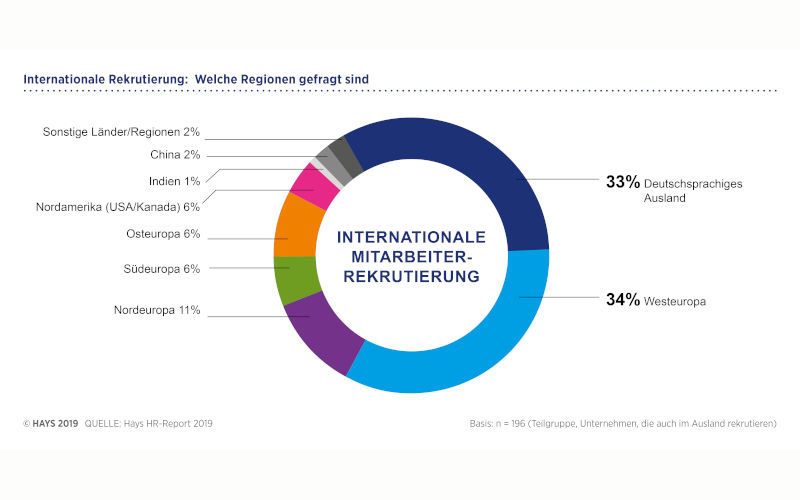 Etwas häufiger als im Vorjahr haben die befragten Unternehmen international rekrutiert. Lag der Wert im letzten Jahr noch bei 16 Prozent, ist er im HR-Report 2019 auf 20 Prozent angestiegen. Wenn Unternehmen international nach neuen Mitarbeitern suchen, sind Westeuropa (34 Prozent), das deutschsprachige Ausland (33 Prozent) und Nordeuropa (11 Prozent) die bevorzugten Adressen. Trotz des hohen Stellenwerts von China für deutsche Unternehmen sucht hier nur ein Prozent nach geeigneten Kandidaten. Weltweit sind dies 11 Prozent der Studienteilnehmer. Trotzdem bildet die Zahl der Unternehmen, die nur regional (51 Prozent) oder deutschlandweit suchen (50 Prozent), noch immer die Mehrheit.