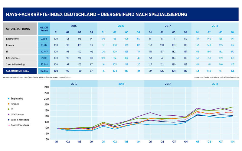 © Hays / Quelle: index Internet und Mediaforschung GmbHTrotz der eingetrübten ökonomischen Großwetterlage im letzten Quartal hat sich der Stellenmarkt für Spezialisten über alle Fachbereiche hinweg weiter positiv entwickelt. Der Hays-Index stieg im 4. Quartal 2018 von 151 auf den neuen Rekordwert von 155 Punkten. Ein Jahr zuvor lag er noch bei 129 Indexpunkten.