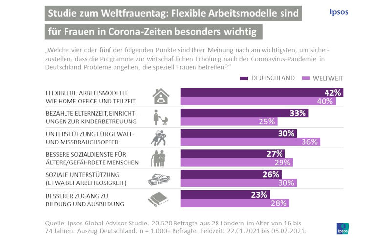 Infografik: Flexible Arbeitsmodelle aktuell besonders wichtig (Quelle: Ipsos GmbH)Fast jeder zweite Deutsche (46%) ist zwar grundsätzlich der Meinung, dass die ungleiche Bezahlung von Männern und Frauen ein wichtiges Thema ist, findet aber nicht, dass man dieses Problem in der aktuellen Situation priorisieren sollte. Drei von zehn Bundesbürgern (30%) sind hingegen trotz Corona-Krise der Ansicht, dass der Ruf nach gleichen Löhnen weiterhin eine hohe Priorität haben sollte. Das zeigt eine aktuelle Umfrage des Markt- und Meinungsforschungsunternehmens Ipsos, die anlässlich des Weltfrauentags in Zusammenarbeit mit dem Global Institute for Women’s Leadership am King’s College London durchgeführt wurde. Weltweit wurden hierfür in 28 Ländern mehr als 20.000 Personen nach ihren Einstellungen in Sachen Gleichstellung befragt.