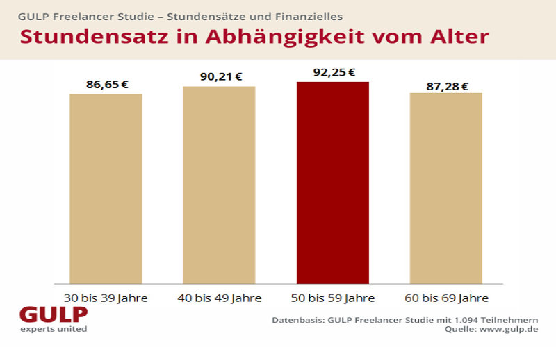 Noch ist es die „zweitälteste“ Kategorie der 50- bis 59-Jährigen, die laut der GULP Freelancer Studie mit 92,25 Euro pro Stunde am besten verdient. Die Umfrageteilnehmer dieser Altersklasse liegen damit 2,38 Euro über dem Gesamtdurchschnitt von 89,87 Euro. Doch die 30- bis 39-Jährigen holen in Sachen Stundensatz immer weiter auf. War 2013 noch ein deutlicher Preisunterschied zwischen dieser Altersgruppe und der altersmäßigen Spitzengruppe von rund 9 Euro pro Stunde zu verzeichnen, so lag dieser in den letzten beiden Jahren nur noch bei rund 5 Euro.
