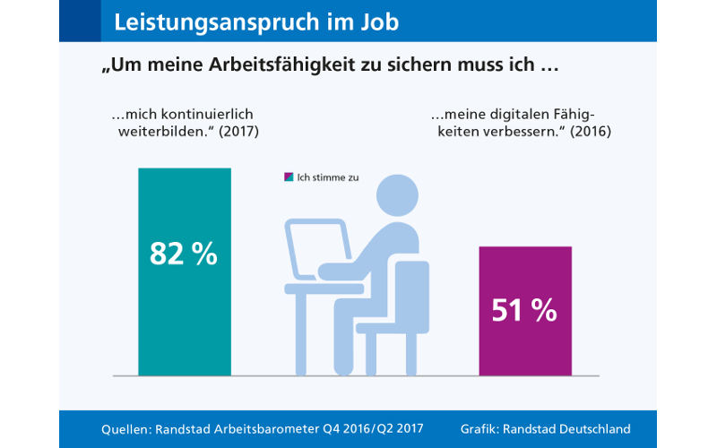 82% der Umfrageteilnehmer sind der Meinung, dass lebenslanges Lernen wichtig ist, um ihre Arbeitsfähigkeit zu erhalten. Die Erkenntnis, dass es ohne Weiterbildung in Zukunft schwerer werden wird, auf dem Arbeitsmarkt zu bestehen, kommt schnell bei immer mehr Arbeitnehmern an. Noch vor einem halben Jahr hatten lediglich 51% der Befragten den Eindruck, dass sie ihre digitalen Kompetenzen verbessern müssen, um ihre Arbeitsfähigkeit zu erhalten (Randstad Arbeitsbarometer Q4 2016). Mit dem technologischen Fortschritt ändern sich Anforderungen immer schneller, Berufsbilder bekommen einen anderen Schwerpunkt oder lösen sich auf und gewohnte Prozesse werden durch neue ersetzt.